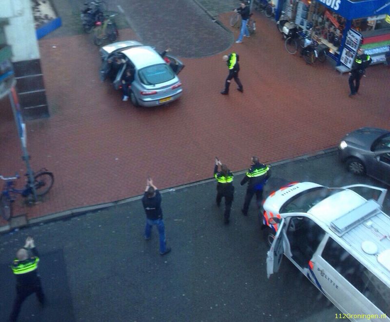 De politie heeft zaterdagmiddag in de Nieuwe Ebbingestraat vier Stadjers en een inwoner van Hoogezand aangehouden. Dat gebeurde met getrokken pistolen.