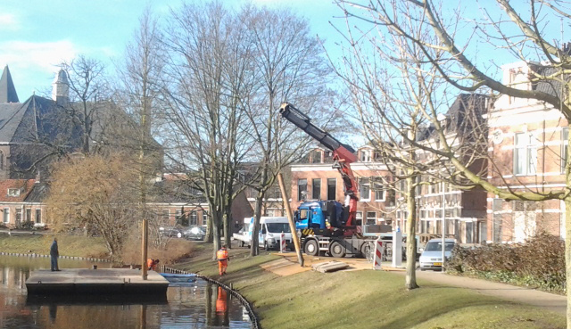 De werknemers van Vegter Waterbouw maakten woensdagmiddag een stalen constructie waarmee ze het sculptuur uit het water konden takelen.