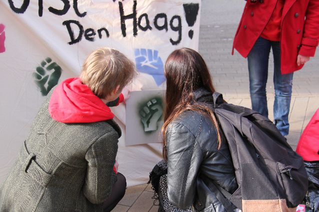 Voorbijgangers konden een vuist op een doek spuiten en hun handtekening er op zetten.