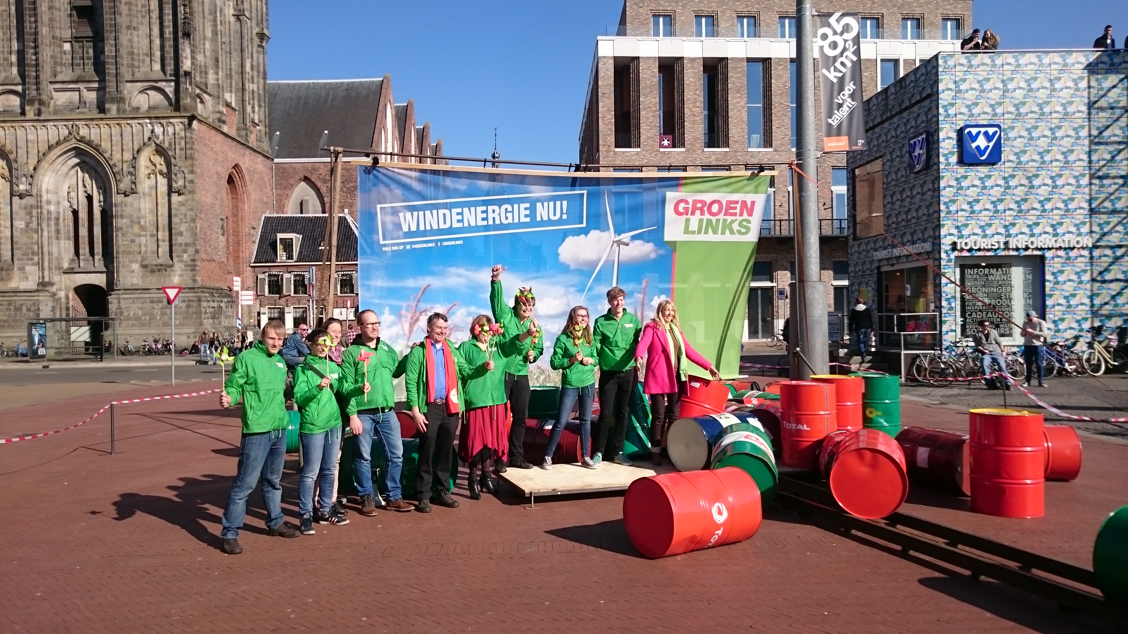 GroenLinks voerde zondag symbolisch actie voor schone energie op de Grote Markt door een aantal olievaten op de Grote Markt om te laten vallen. De partij wil dat de gaswinning dit jaar wordt teruggebracht naar 30 miljard kuub en later nog verder wordt afgebouwd.