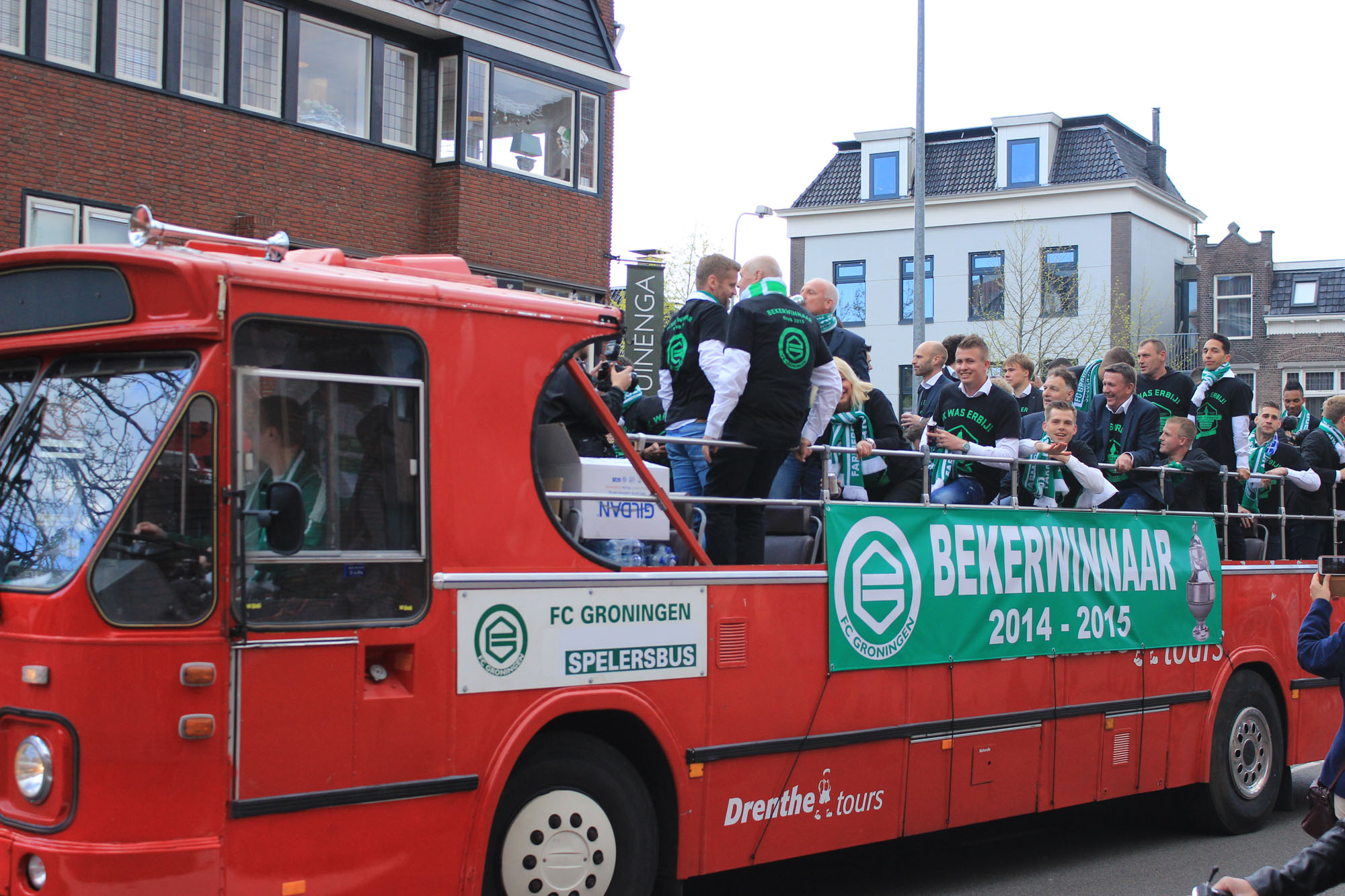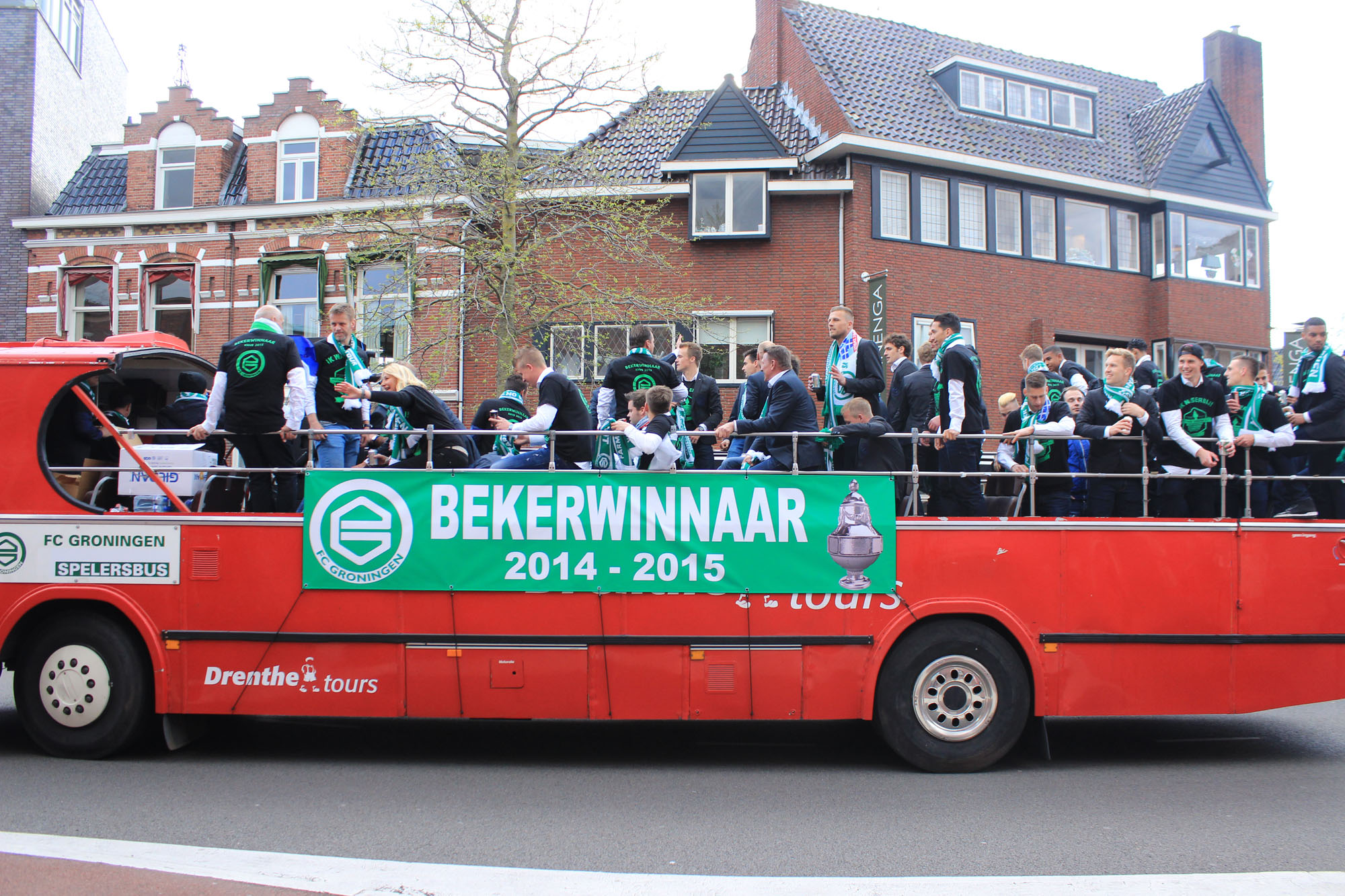 Met een open bus vertrokken de spelers vanaf het Euroborgstadion via het centrum naar de drafbaan waar 30 duizend mensen verwacht worden.