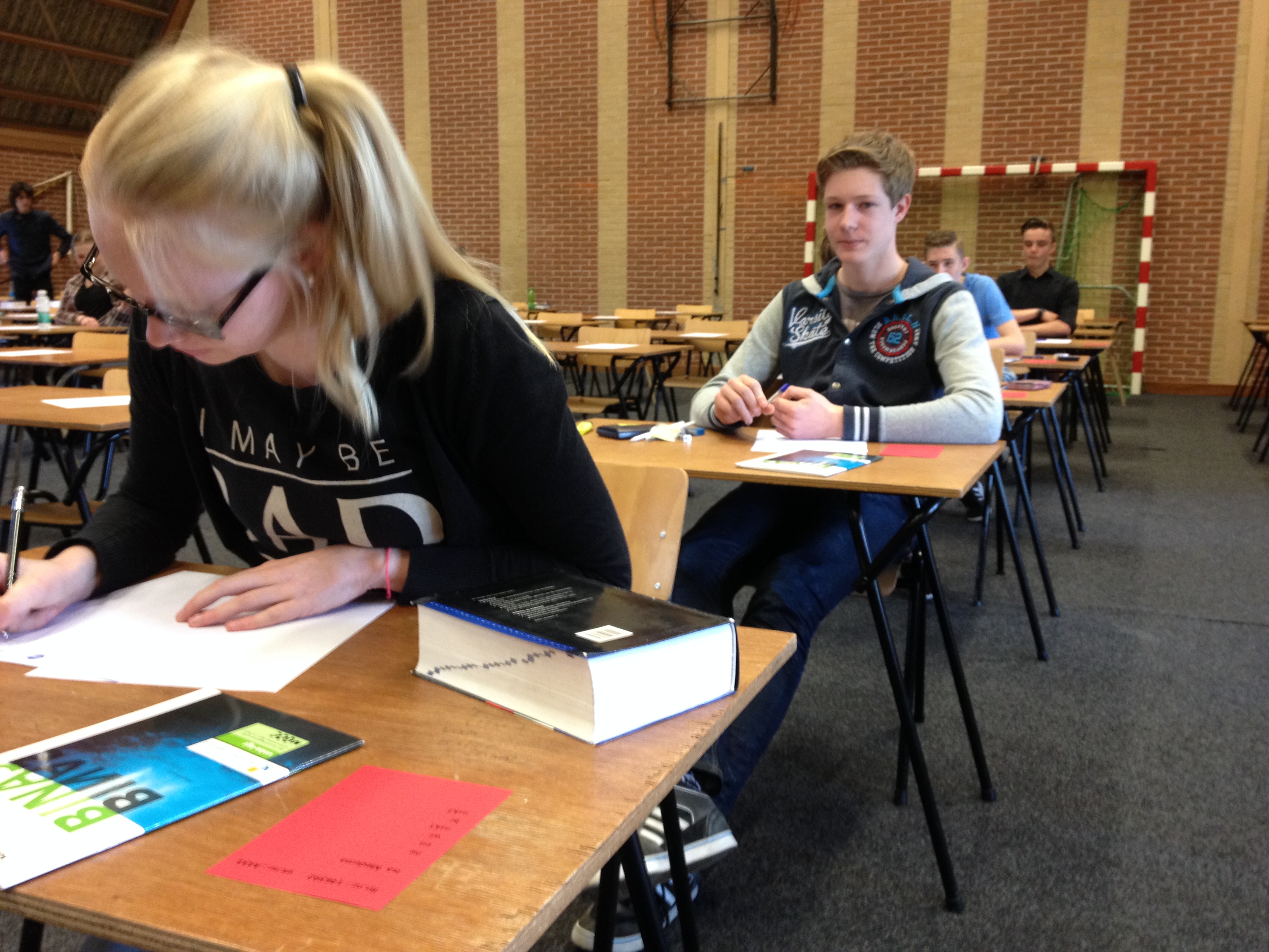 In de aula van het CSG Augustinus verzamelen zich rond 13.00 uur de eerste eindexamenleerlingen. “Een beetje zenuwachtig ben ik wel”, zegt havo-leerling Dirk-Jan Smid. “Economie is gewoon niet mijn vak. Die ingewikkelde begrippen. Het raakt mij gewoon niet, dus ik denk dat deze appel behoorlijk zuur gaat smaken.” Luitzen-Jan Beiboer is ondertussen heel wat zekerder. “Je fietst enigszins gespannen naar school, maar ik denk dat ik vanmiddag toch wel zeker een acht of een negen moet kunnen halen.”