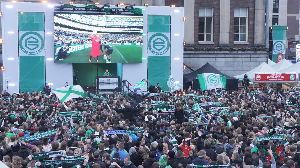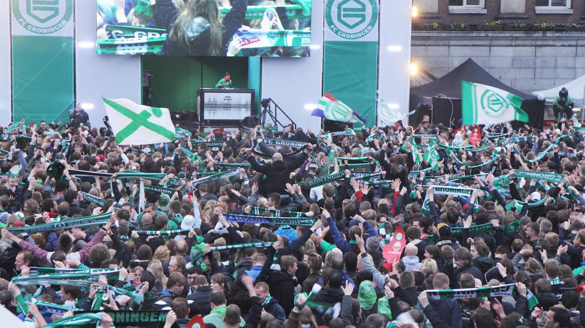 Na het laatste fluitsignaal ging op de Grote Markt het spreekwoordelijke dak er af. De eerste echte prijs in de geschiedenis van FC Groningen was een feit.