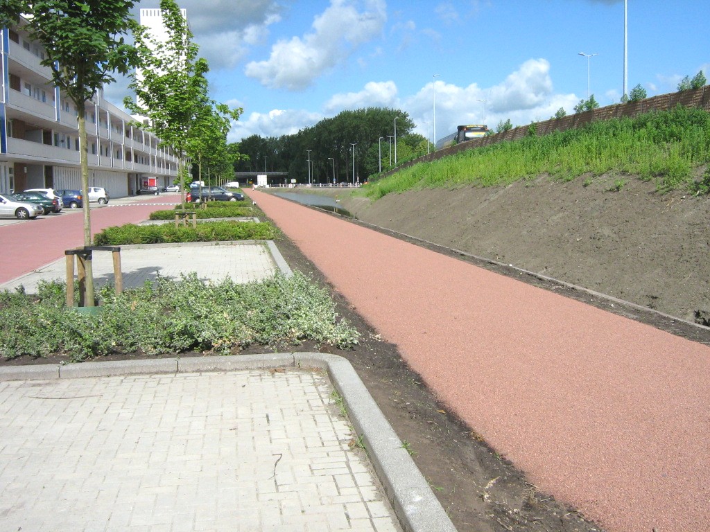 Tussen de wijk Cortinghborg en de ringweg ligt een geheel nieuw fietspad (foto), dat nog moet worden aangesloten op het fietspad naar Selwerd. Ook het vernieuwde fietspad van de Poortstraat naar de tunnel onder de Noordzeebrug ligt er al.