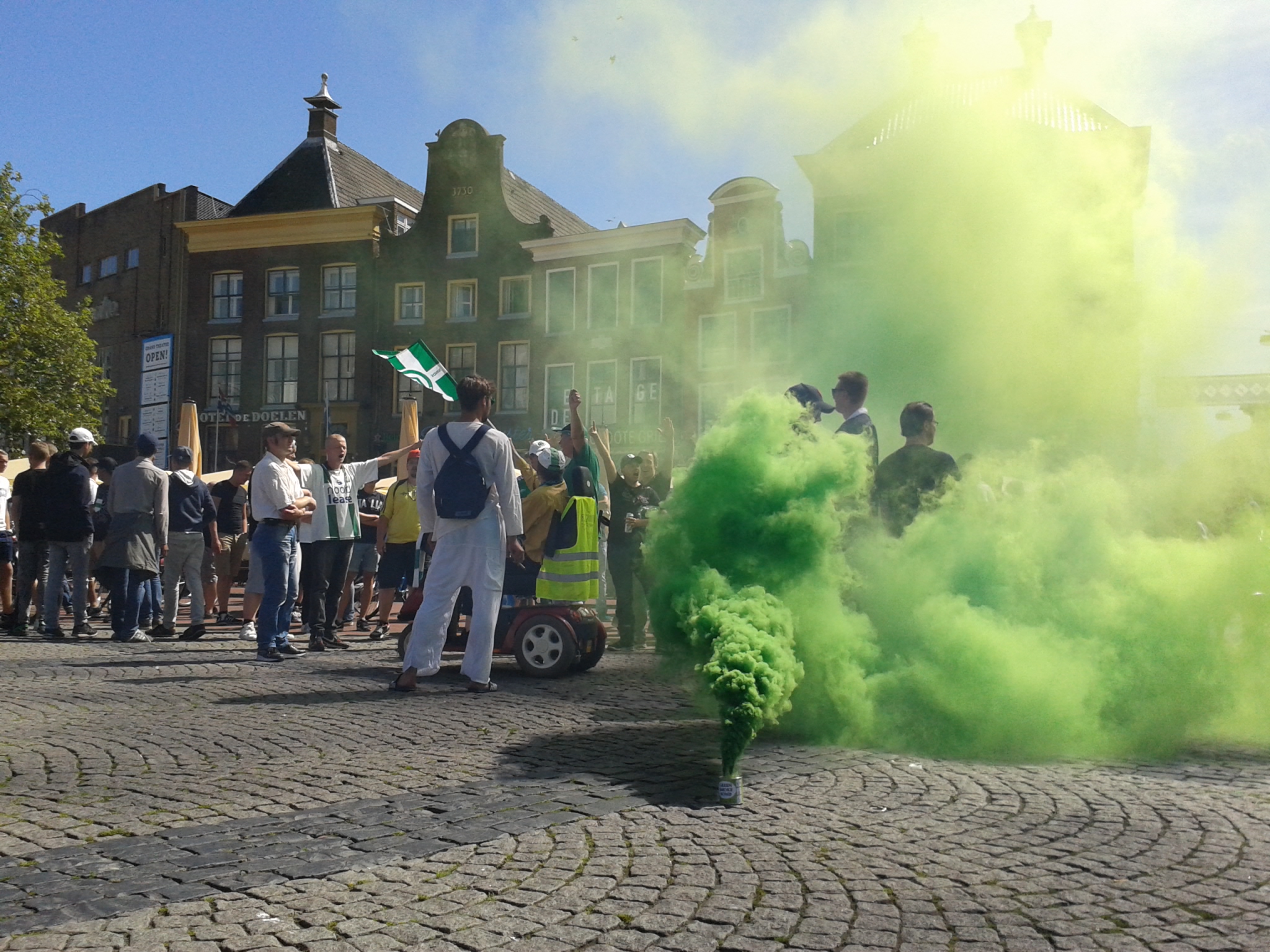 De deelnemers liepen van Cafe Pub050 op de hoek Zuiderdiep – Stationsstraat naar de Grote Markt. De demonstranten hielden het netjes en gooiden enkel wat groene rookbommen. De politie hoefde niet in te grijpen.