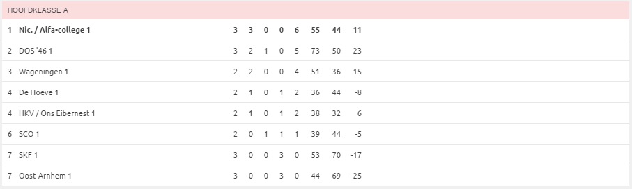 Door de winst staat Nic. nu op de eerste plaats in de Hoofdklasse A met zes punten uit drie wedstrijden. Volgend weekend staat de noordelijke derby tegen SCO uit Oldeholtpade op het programma.
