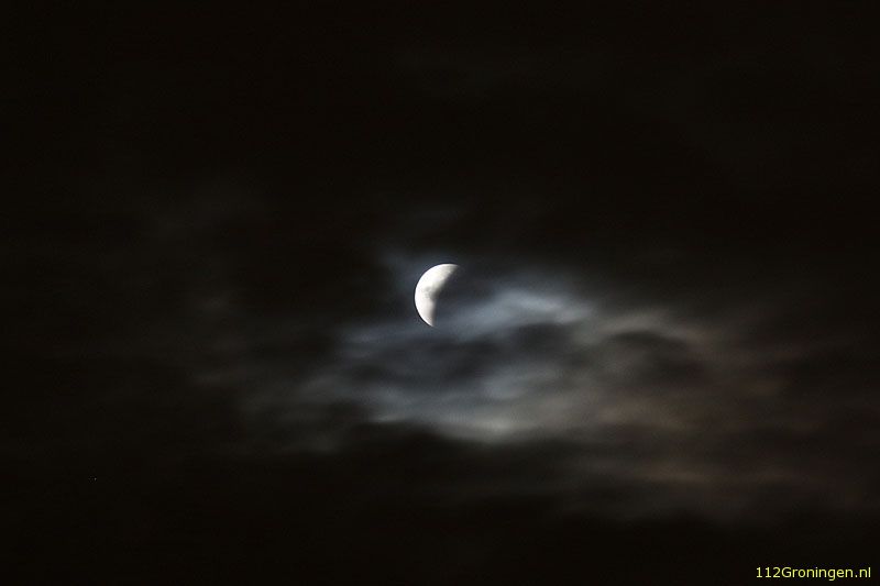 De maansverduistering was vanmorgen in Groningen door de bewolking die er hing nauwelijks te zien. Om iets voor vijf uur stond de aarde precies tussen de zon en de maan.