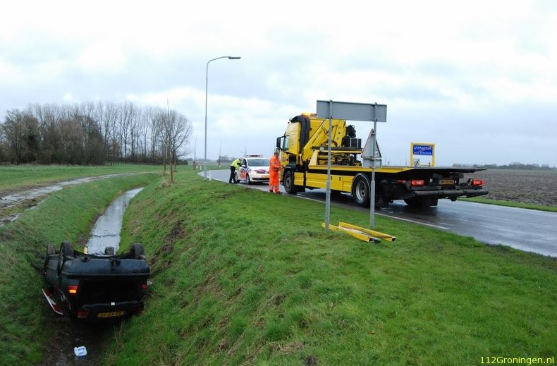 Een automobilist werd bij Uithuizen verrast door een zware windstoot die de auto een sloot in blies. Foto: 112groningen.nl