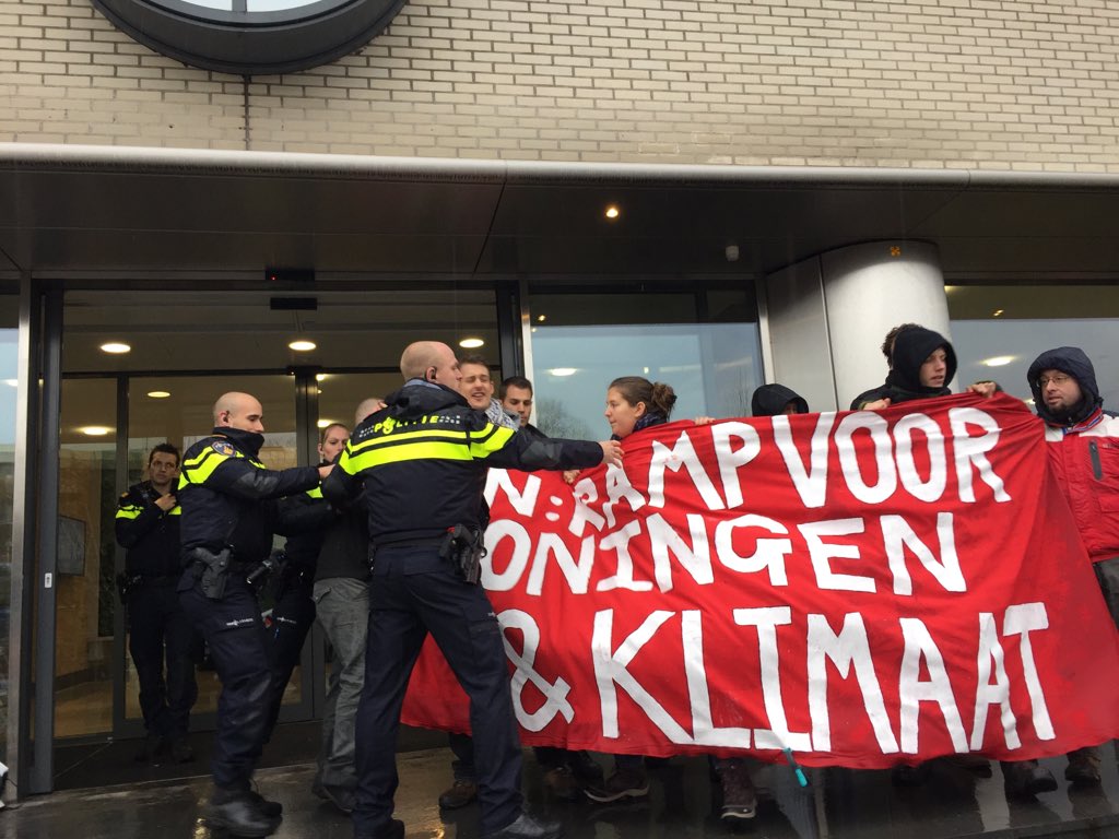 De hoofdingang werd geblokkeerd. Volgens de demonstranten gebruikten agenten veel geweld, waaronder de nekklem, bij het verwijderen van de actievoerders.