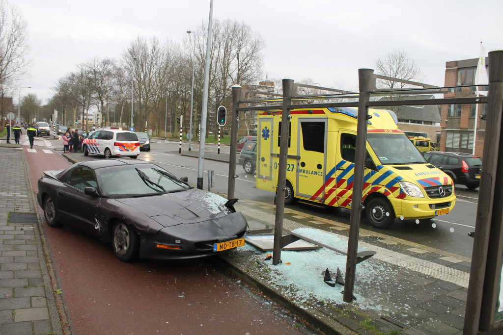 Een inzittende is voor controle naar het ziekenhuis vervoerd. Een van de auto’s kwam tegen een bushalte tot stilstand. Het hokje liep eveneens forse schade op.