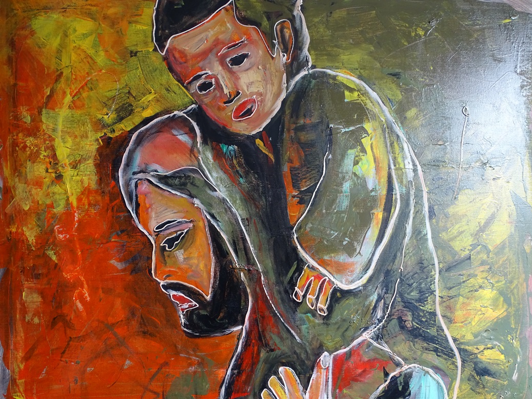 De 34-jarige Abha is op 16-jarige leeftijd gevlucht uit Afghanistan. In dat land was het maken van kunst verboden. Omdat Abha in armoede is opgegroeid is dat vaak het thema van zijn schilderijen.