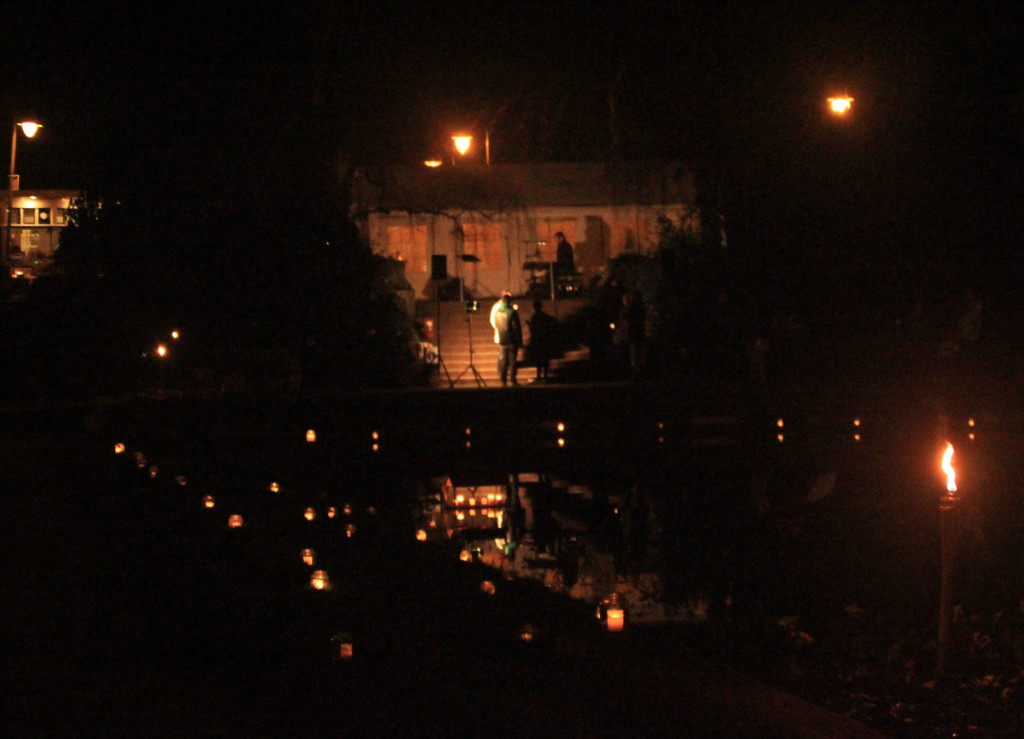 De centrale vijver in het Noorderplantsoen was zondagavond het toneel van veel kaarsen en andere lichtjes.