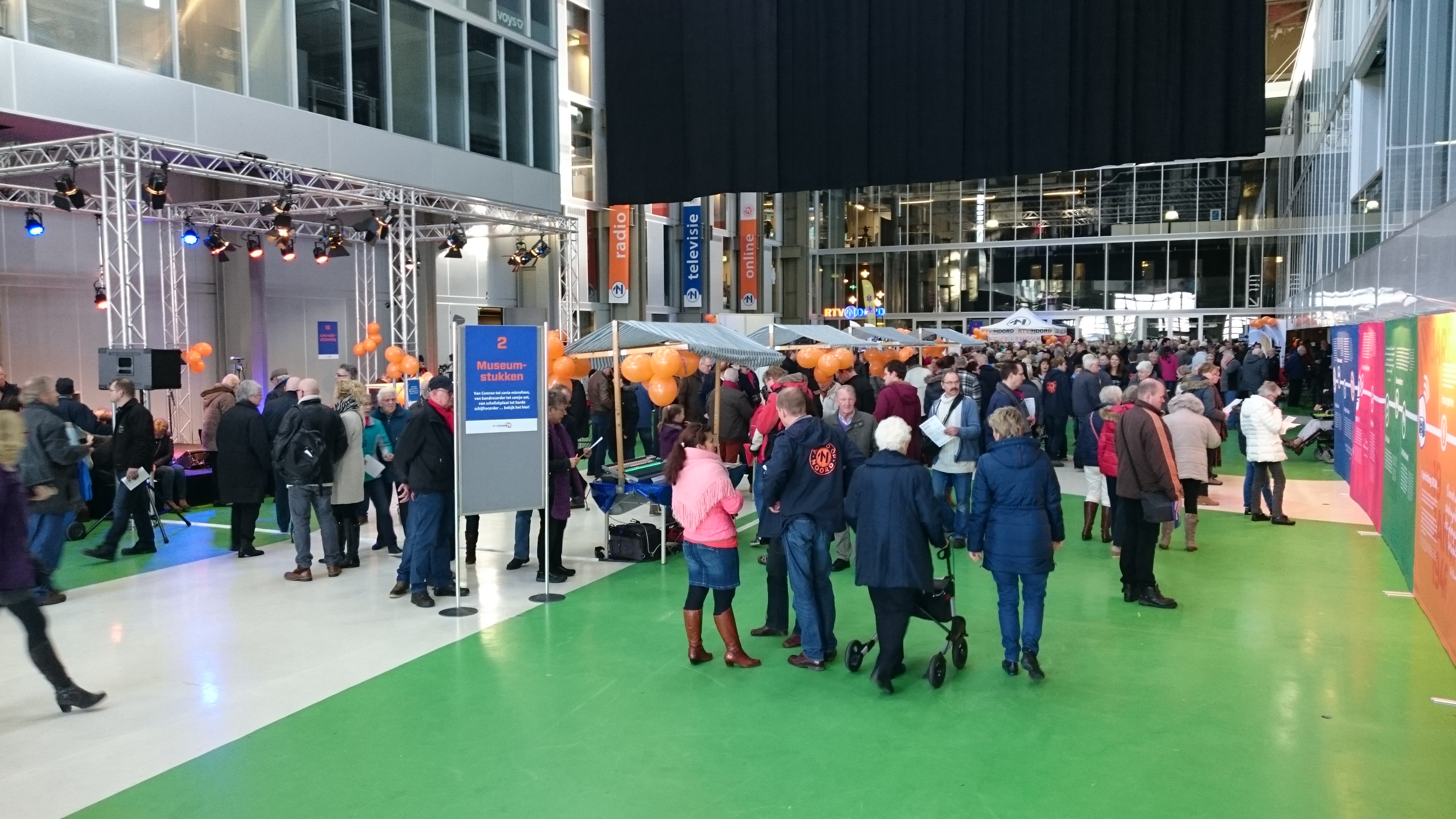 In de centrale hal was apparatuur uit heden en verleden te bekijken, waren live optredens van Groninger artiesten en kon men op de foto als nieuwslezer. Er was ook een “Kovvie en Kouke” hoek, waar onder anderen diverse presentatoren als Cunera van Selm en Harma Boer bezoekers aan koffie, thee en limonade en een koek hielpen.