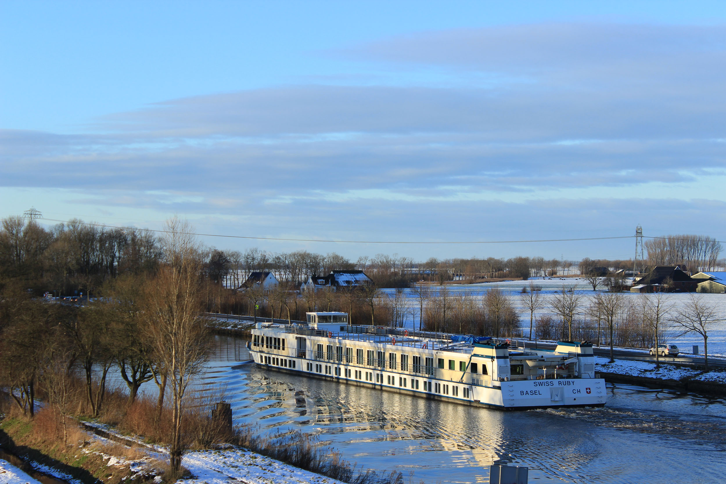 Zaterdagavond was de laatste dag van Eurosonic/Noorderslag en konden zondag de hotelboten weer vertrekken. Op de foto een hotelschip dat in de namiddag over het Van Starkenborghkanaal de stad verliet.