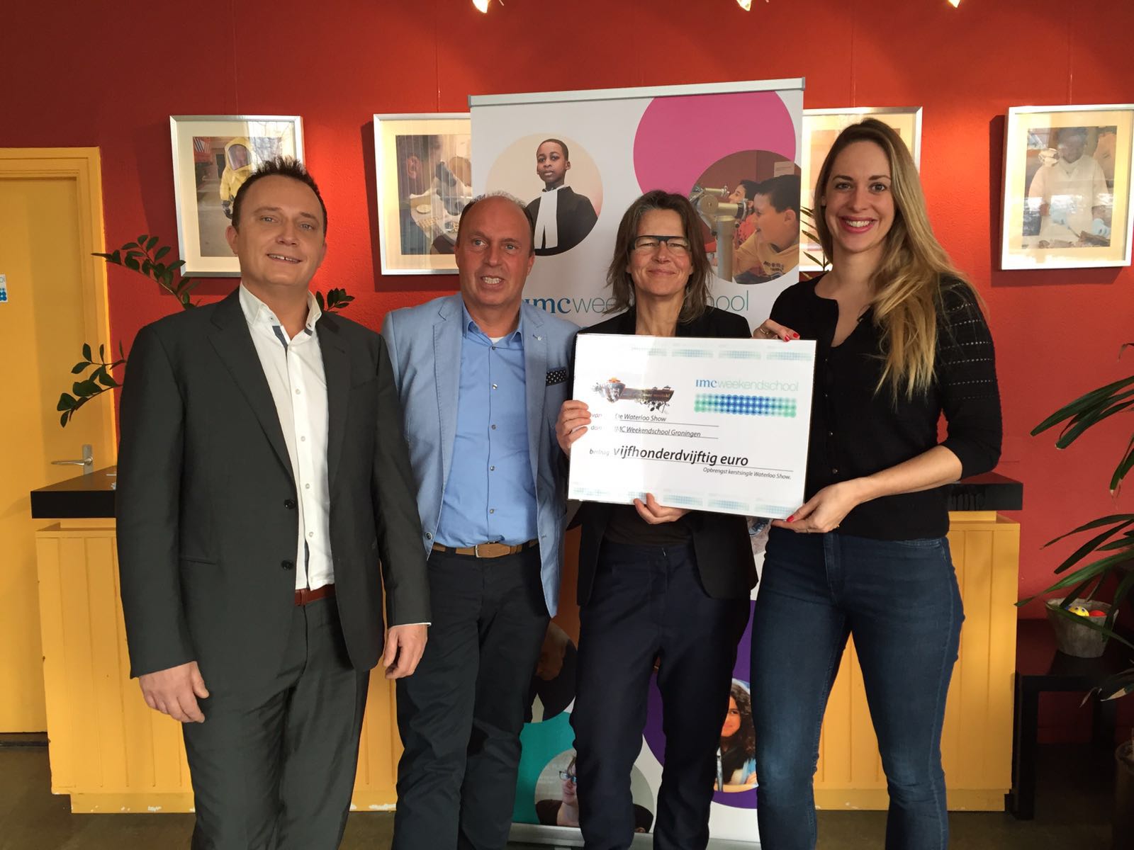 Namens de IMC Weekendschool namen teammanager Inge van der Veen en docent Sarah Euwema de cheque in ontvangst. Ze waren blij met de opbrengst maar ook met de samenwerking met Milano en Harry Waterloo, die het belang van de IMC Weekenschool nogmaals benadrukten.