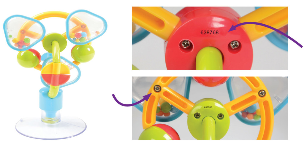Het gaat om een speeltje, dat met een zuignap op een kinderstoel kan worden gemonteerd. Het probleem komt alleen voor bij een aantal speeltjes met batchnummer 638768. Het speeltje lag sinds juli in de winkel en is ruim driehonderd keer verkocht. De fabrikant zegt het probleem intussen verholpen te hebben. De nieuwere versies van het speelgoed zouden wel veilig zijn.
