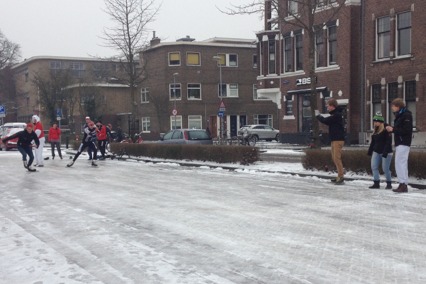 De plotselinge ijzel heeft niet alleen nadelen. Studentenvereniging TJAS heeft spontaan een schaatswedstrijd georganiseerd op een parkeerplaats aan de Hoensdiepskade.