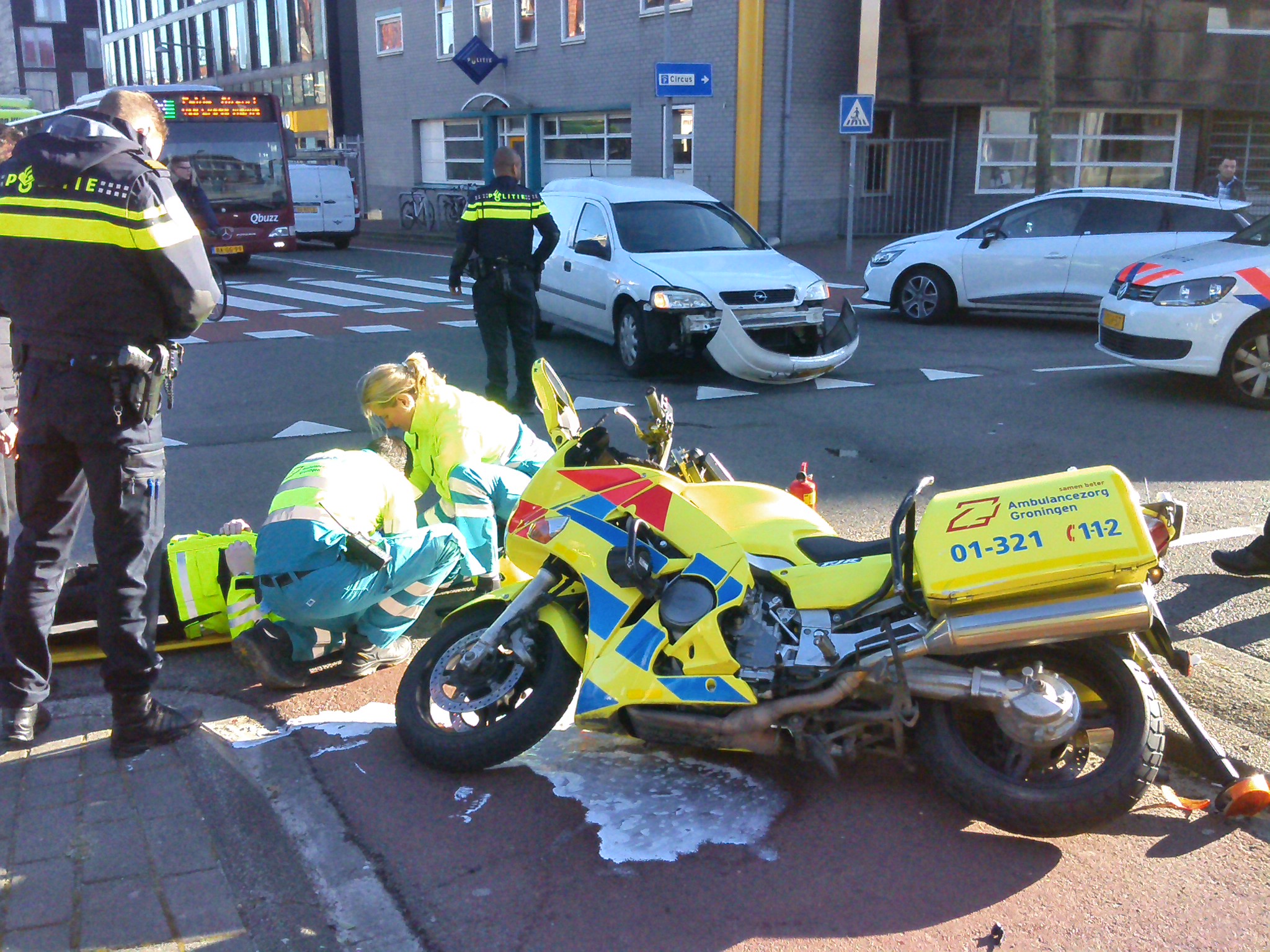 Op de hoek van de Korreweg en de Rodeweg is dinsdagochtend rond 10.30 uur een motorambulance aangereden door een personenwagen. De bestuurder van de motor is daarbij gewond geraakt.