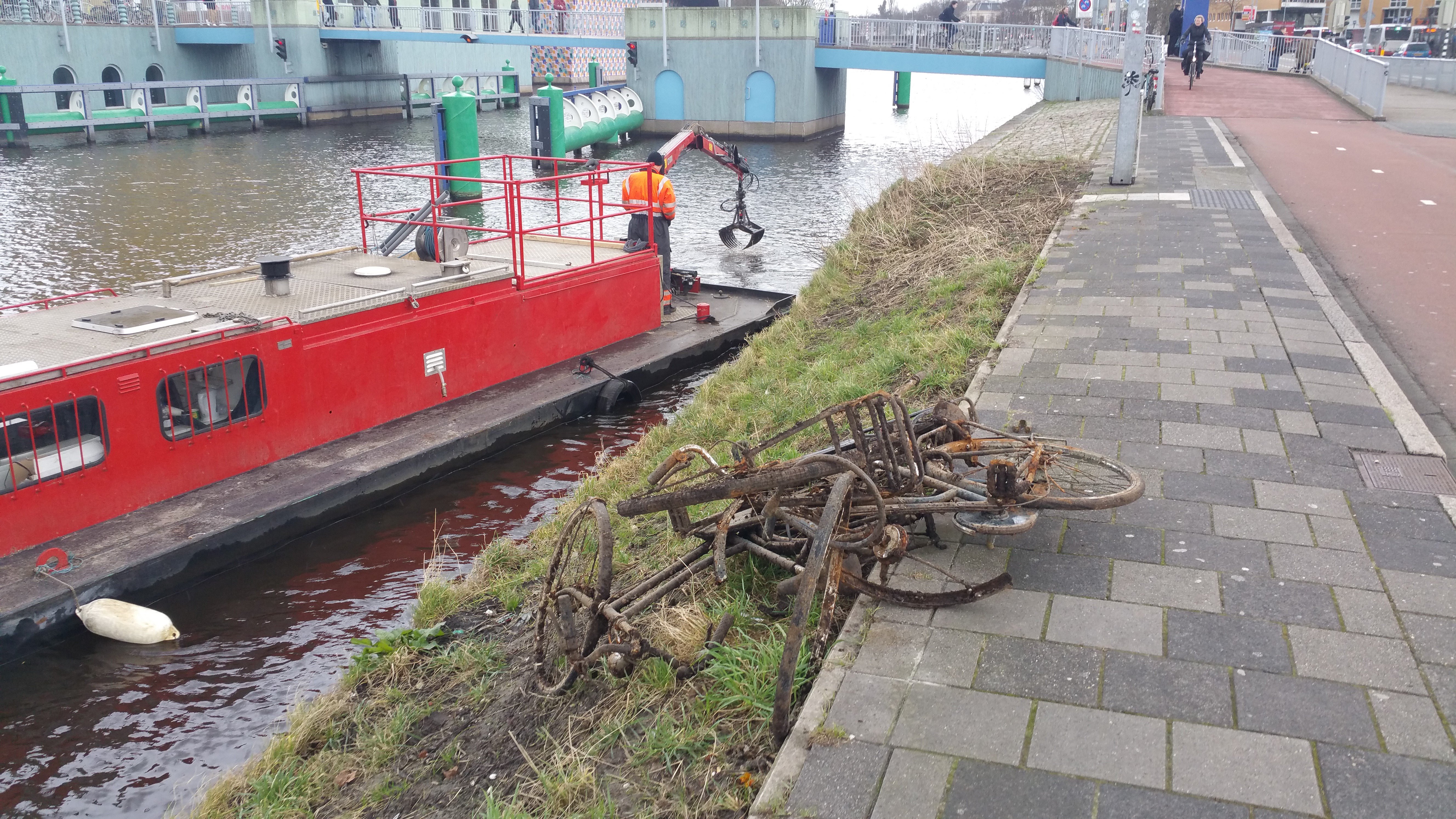 Dat doet de gemeente met een speciale boot. De fietsen worden op de wal getakeld en later opgehaald.