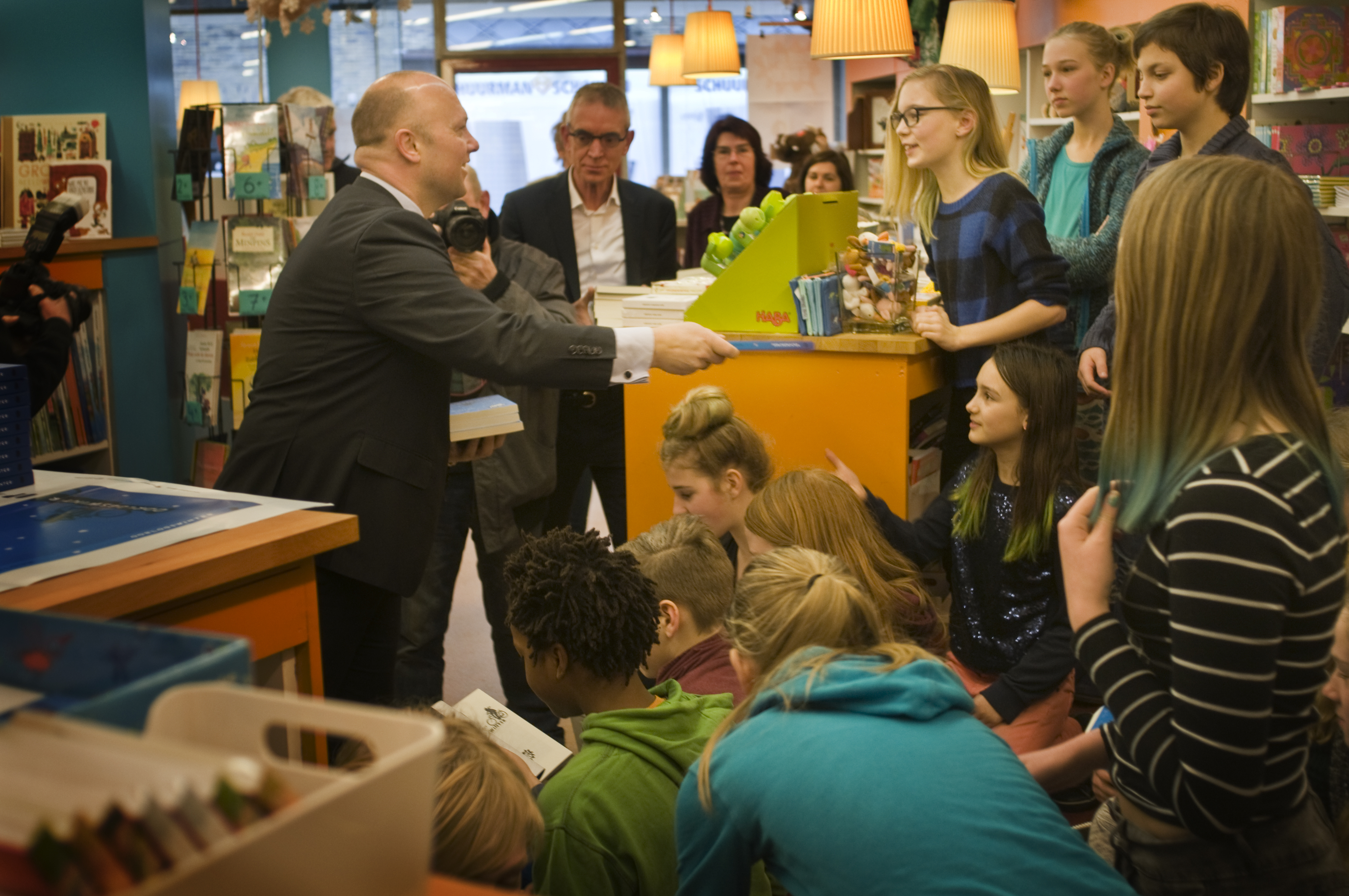 Zo’n 7.500 jonge Stadjers krijgen een brief waarmee ze tot 5 mei een speciale uitgave van het boek kunnen afhalen bij een boekhandel. Wethouder Ton Schroor reikte vrijdagochtend de eerste exemplaren uit aan leerlingen van groep 8 van de Borgmanschool.