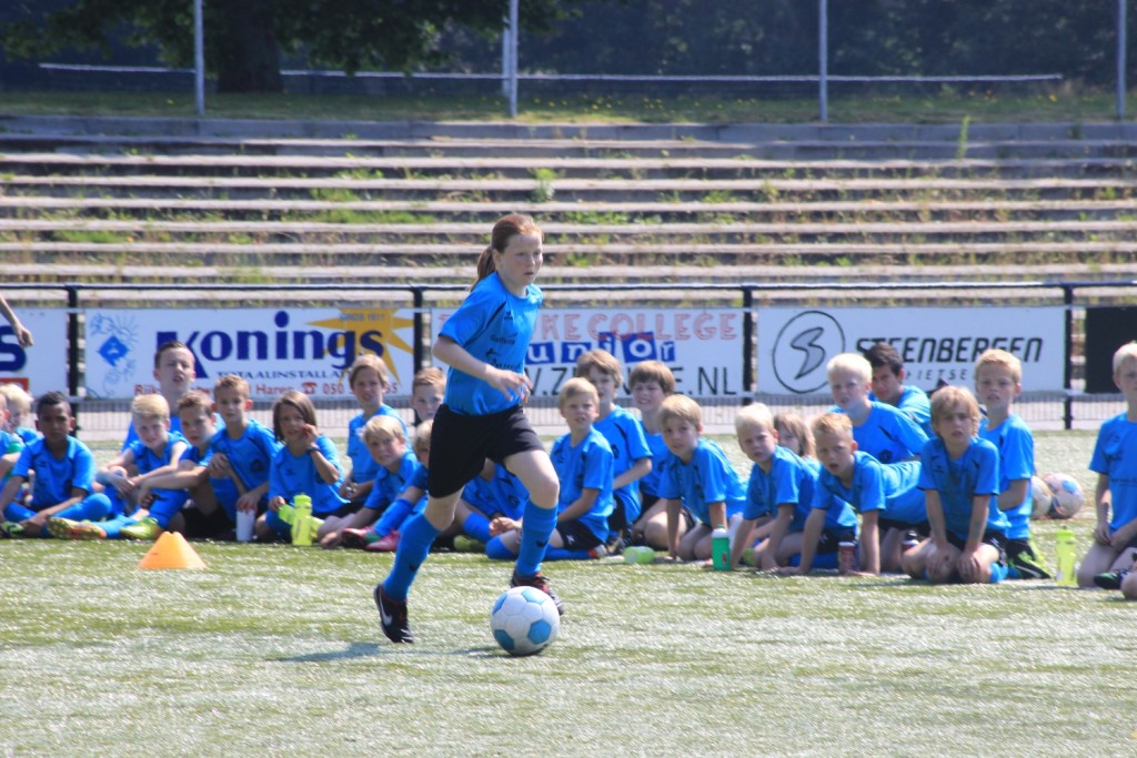Foto Andor Heij. Nikée, één van de weinige meisjes, was wel alle jongens de baas bij dribbelen en afwerken.