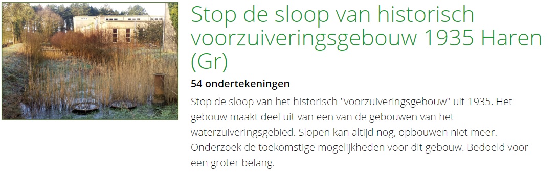 In Haren is een bewoner een petitie gestart tegen de plannen om een oud waterzuiveringsgebouw te slopen. Dat meldt het Harener Weekblad woensdag.
