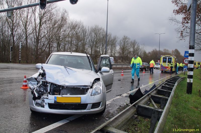Door een nog onbekende oorzaak kwamen twee de auto’s met elkaar in botsing. Een van de wagens draaide door de klap om zijn as heen en kwam tegen de rijrichting tot stilstand. De gewonde personen zijn met onbekend letsel naar het ziekenhuis gebracht.