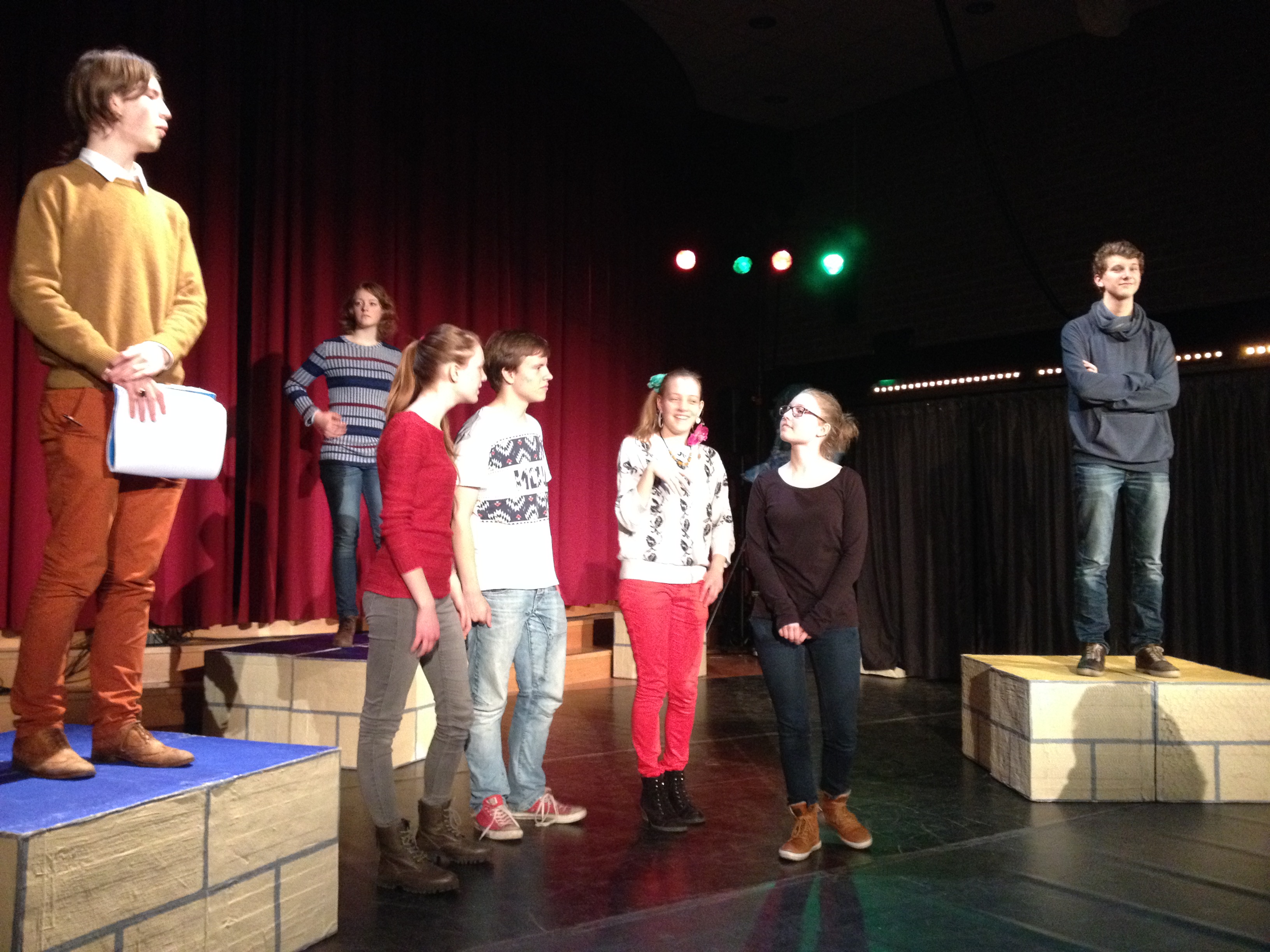 “Dit moet echt sneller”, zegt regisseur Hiepie Hoogeveen tegen een groep leerlingen die het podium moeten betreden. “Het moet vloeiend doorlopen zonder dat we te hoeven wachten.” Het is woensdagmiddag in de aula van het WLG. Op het programma staat de generale repetitie waarbij de laatste puntjes op de ‘i’ worden gezet.