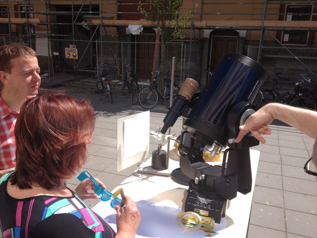 Om de telescopen hebben zich tientallen leerlingen verzameld. “Het zou nu toch bijna moeten gebeuren”, zegt een docent terwijl ze op haar horloge kijkt. Niet veel later verschijnt er een klein stipje voor de zon. “Kijk, Mercurius! Daar is ie!” Roepen verschillende leerlingen enthousiast. Het beeld van één van de telescopen wordt geprojecteerd op een wit vel papier waarop de planeet duidelijk te zien is. “Dit vind ik heel bijzonder.”