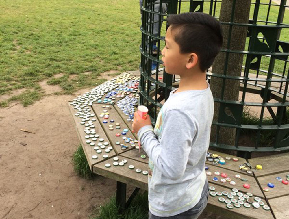 De kinderen hebben vervolgens honderden bierdoppen verzameld en uitgestald (foto). De bierdoppen en ook andere rommel zijn een grote ergernis bij omwonenden van het Noorderplantsoen.
