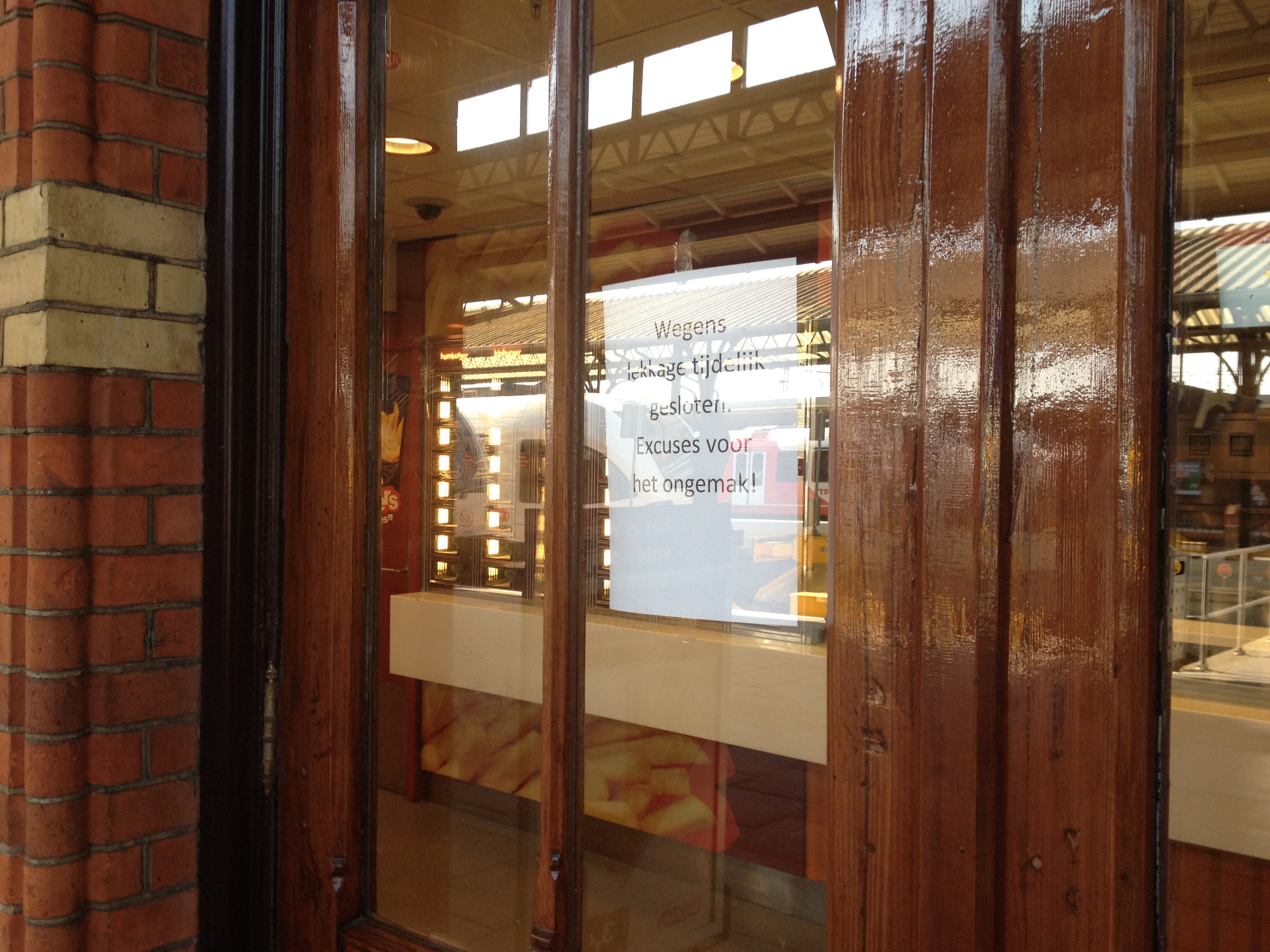 Reizigers die woensdagmiddag van plan waren om een patatje te halen kwamen voor een dichte deur te staan. Op de deur was een formulier geplakt met de mededeling dat de vestiging tijdelijk gesloten was vanwege een lekkage in de snackbar.