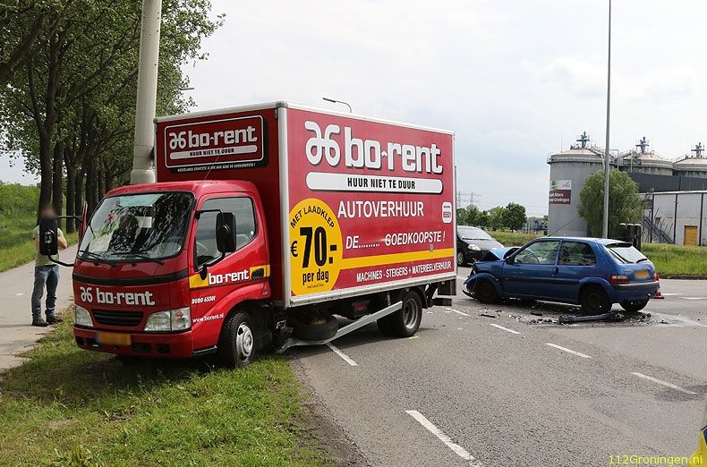 Conclusie: blauwe auto moet veel te hard gereden hebben (zie ook: http://www.rtvnoord.nl/nieuws/163288/Verhuiswagen-komt-in-botsing-met-auto-in-Stad) en huurder Bo-Rent verhuiswagen (afslaand verkeer & haaientanden) overschatte de snelheid waarmee zo'n bak optrekt..