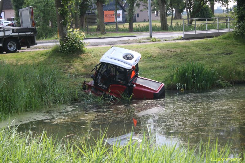 De bestuurder was het gras aan het maaien toen zijn voertuig weggleed en deels in de vijver belandde. De maaier is met een kraan op het droge getrokken.