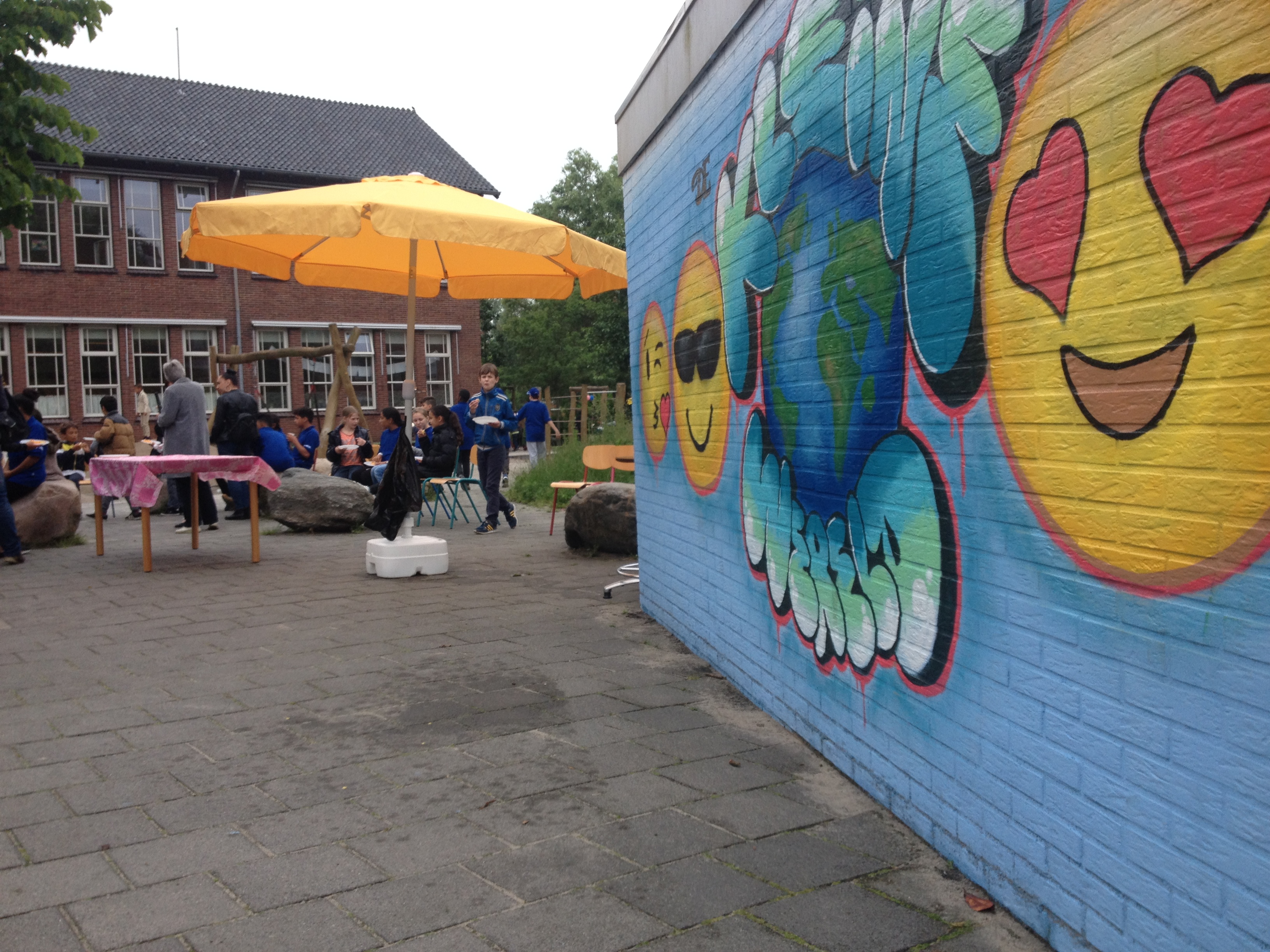 Bij het verbeteren viel het oog al snel op het schoolplein. “Dat kon wel wat vrolijker”, zegt Silvanco. “We hebben toen ideeën aangedragen als een zwembad, een game-hal en een trampoline”, vult haar klasgenootje Yousa aan. “Uiteindelijk is het een graffiti-kunstwerk geworden, dat de leerlingen ontworpen hebben en door een professionele kunstenaar is aangebracht op een muur.