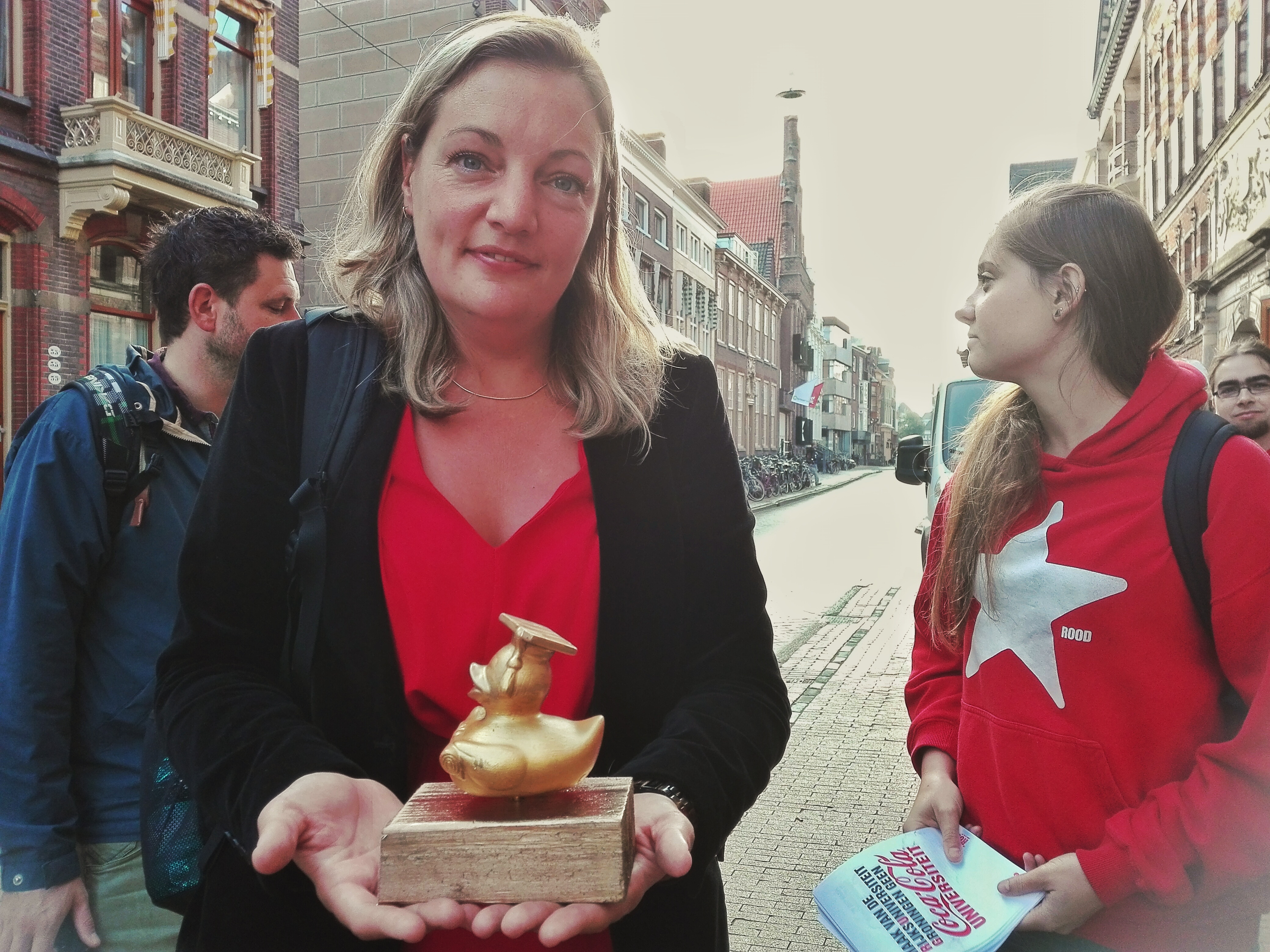 Nog voor het college van bestuur van de RUG aan haar vergadering kan beginnen staat SP op woensdagochtend met een groot spandoek op de stoep. Samen met jongerenorganisatie ROOD hebben zij de gouden WC-eend aan rector magnificus Elmer Sterken overhandigd. De eend is een award als kritiek op de commercialisering van de wetenschap.