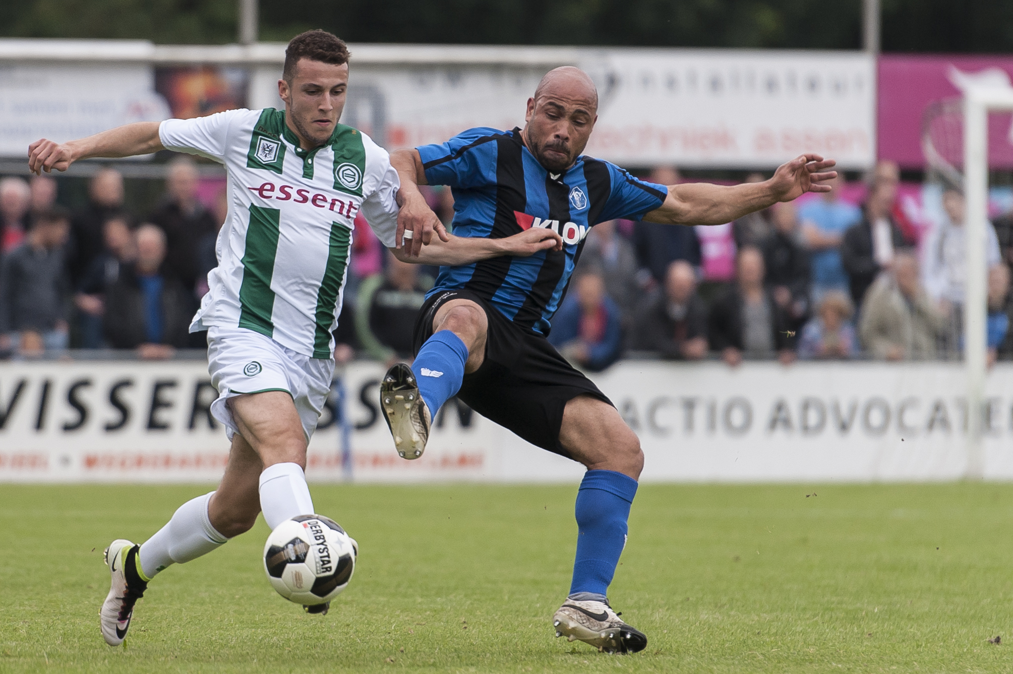 Foto: Sportphotoagency.com Oussama Idrissi van FC Groningen (l) in duel met Angelo Cijntje, die zijn laatste wedstrijd voor ACV speelde.