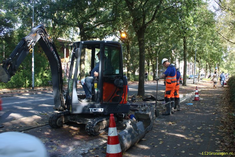 Er is dinsdagmiddag een waterlek ontstaan aan de Eikenlaan in Selwerd. De oorzaak is nog onbekend.