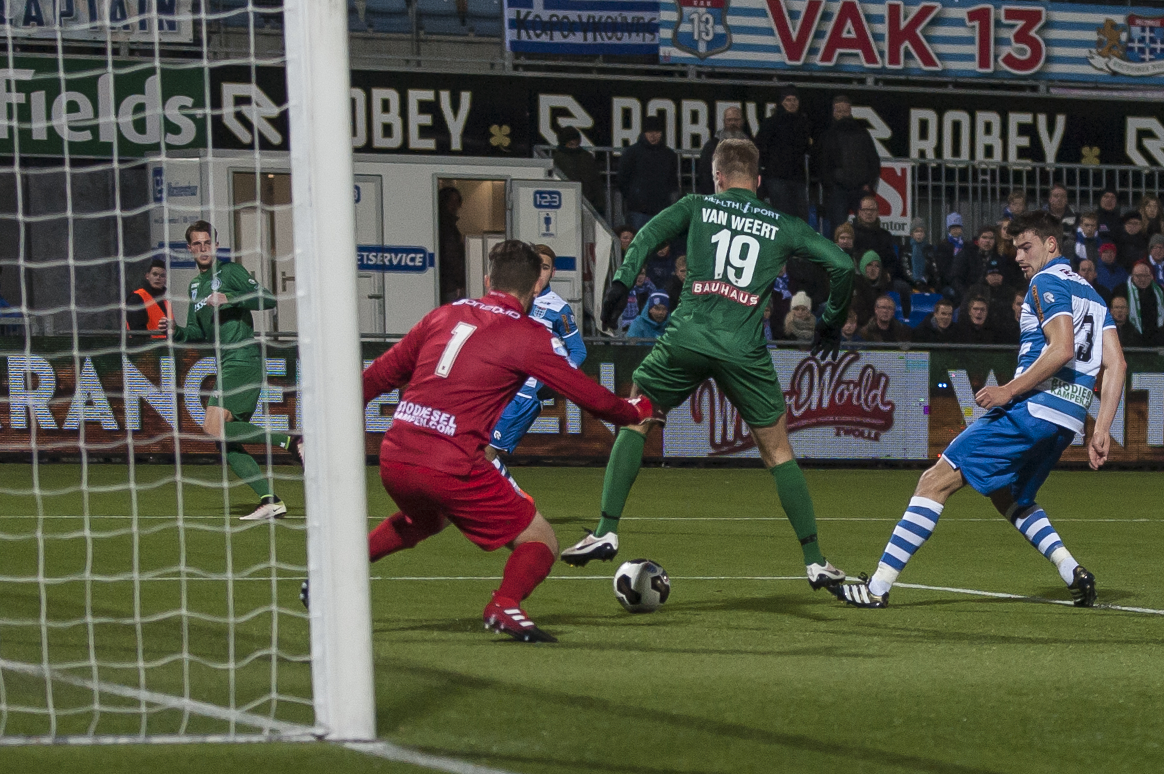 FC Groningen kwam al binnen een minuut op voorsprong via Simon Tibbling. PEC Zwolle was daarna de betere ploeg, maar Sergio Padt hield zijn doel een paar keer knap schoon. FC Groningen kreeg nog een goede kans toen Tom van Weert op de paal knalde. Na 40 minuten scoorde Van Weert wel. Hij zette zijn voet nog net tegen een inzet van Hans Hateboer: 2-0. Van Weert stond wel buitenspel, maar dat ontging de arbitrage.