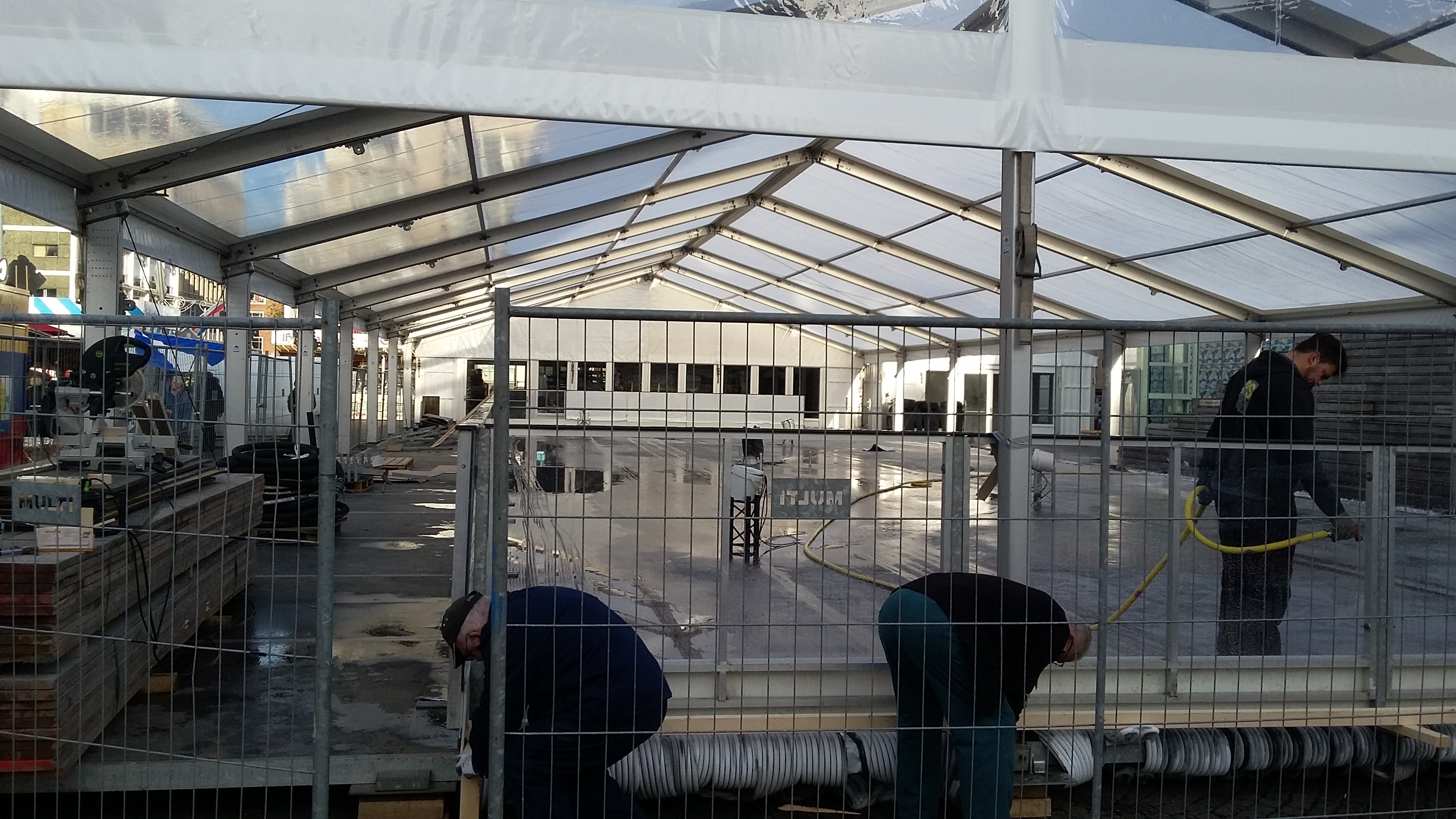 Op de Grote Markt wordt druk gewerkt aan de opbouw van de ijsbaan. De baan meet 65 bij 12 meter en komt voor het informatiecentrum te staan.