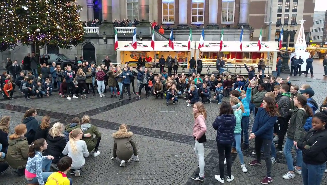 Eerst waren het slechts enkele scholieren, maar al snel stond de Grote Markt vol met leerlingen van het HN Werkman college. 220 jongeren deden mee aan de flashmob.