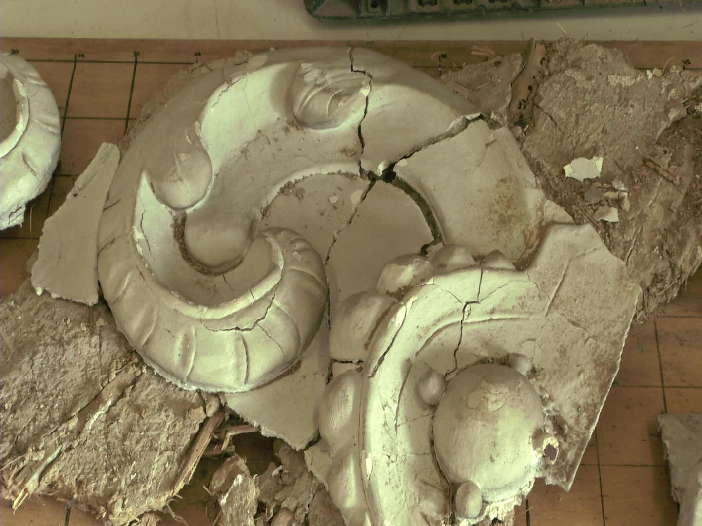 Het zeventiende eeuwse plafond blijft voorlopig verborgen achter het huidige plafond. De gevonden brokstukken zijn overgebracht naar de Stichting Monument en Materiaal waar ze verder worden onderzocht.