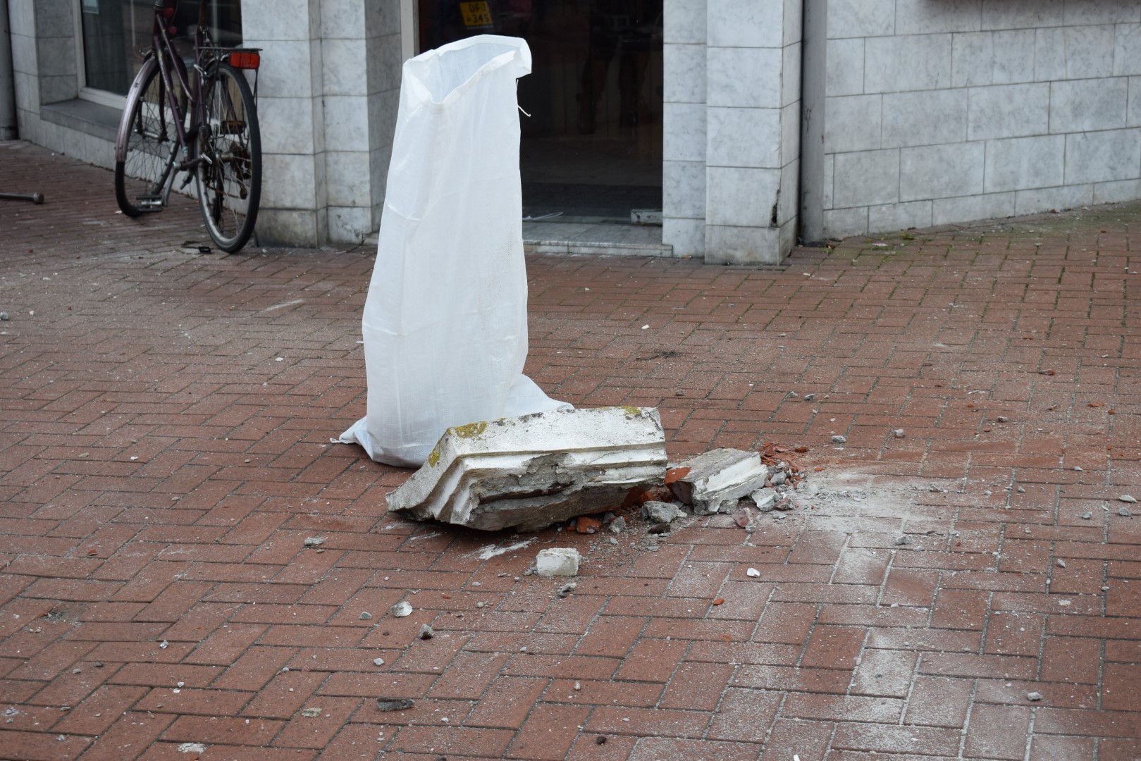 Een deel van een gevel van een pand aan de Nieuwe Ebbingestraat is zaterdagmiddag naar beneden gevallen. Er raakte niemand gewond.