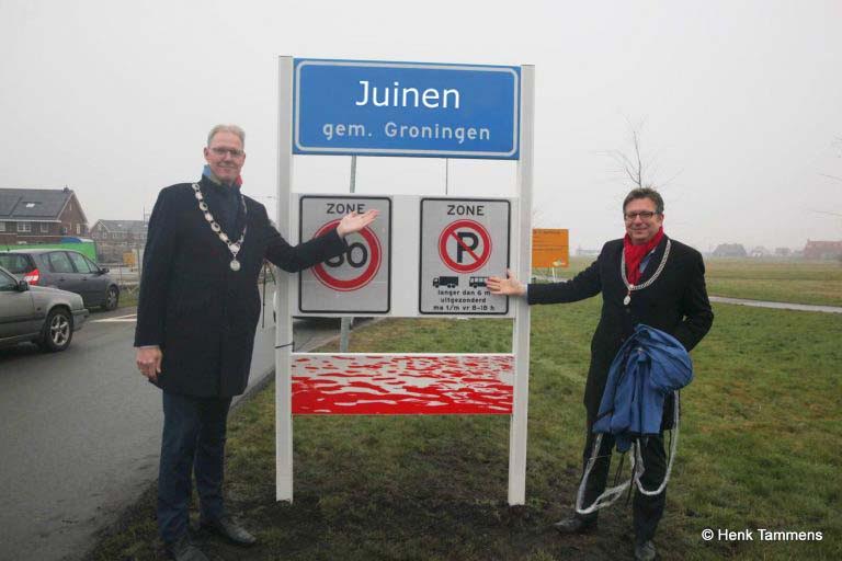 De burgemeester van Slochteren, Geert-Jan ten Brink en wethouder Roeland van der Schaaf staan trots naast een bord met daarop de tekst: ” Juinen Gemeente Groningen”. De foto is een bewerkte versie van een foto die gisteren gepubliceerd werd waarop het tweetal trots poseert naast een vergelijkbaar bord.