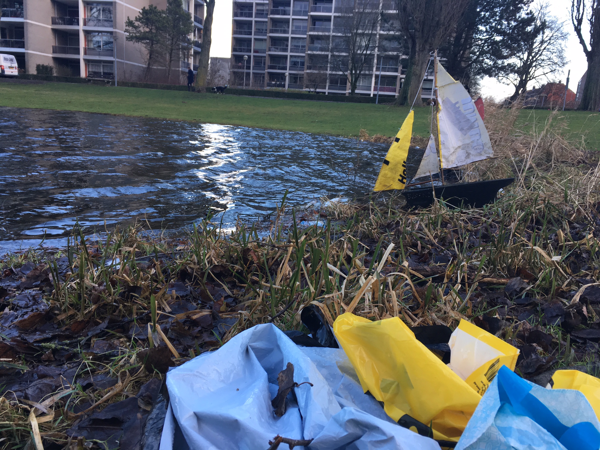 De afgelopen weken lag het scheepje samen met 3 anderen in de vijver. De vaartuigen zijn gemaakt van gerecycled plastic.