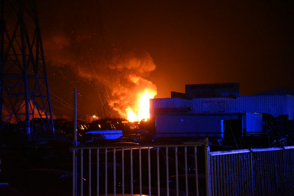 De brand werd even na 22.00 uur gemeld waarop de Groninger brandweer uitrukte met een bluswagen en een hoogwerker. Bij aankomst troffen de brandweerlieden een flinke stapel auto’s aan die in brand stonden. Hierop werd ook de assistentie van een schuimblusvoertuig ingeroepen. Vanaf enkele honderden meters afstand zagen fotografen van de incidentenwebsite 112groningen.nl een flinke vuurkolom boven het terrein.