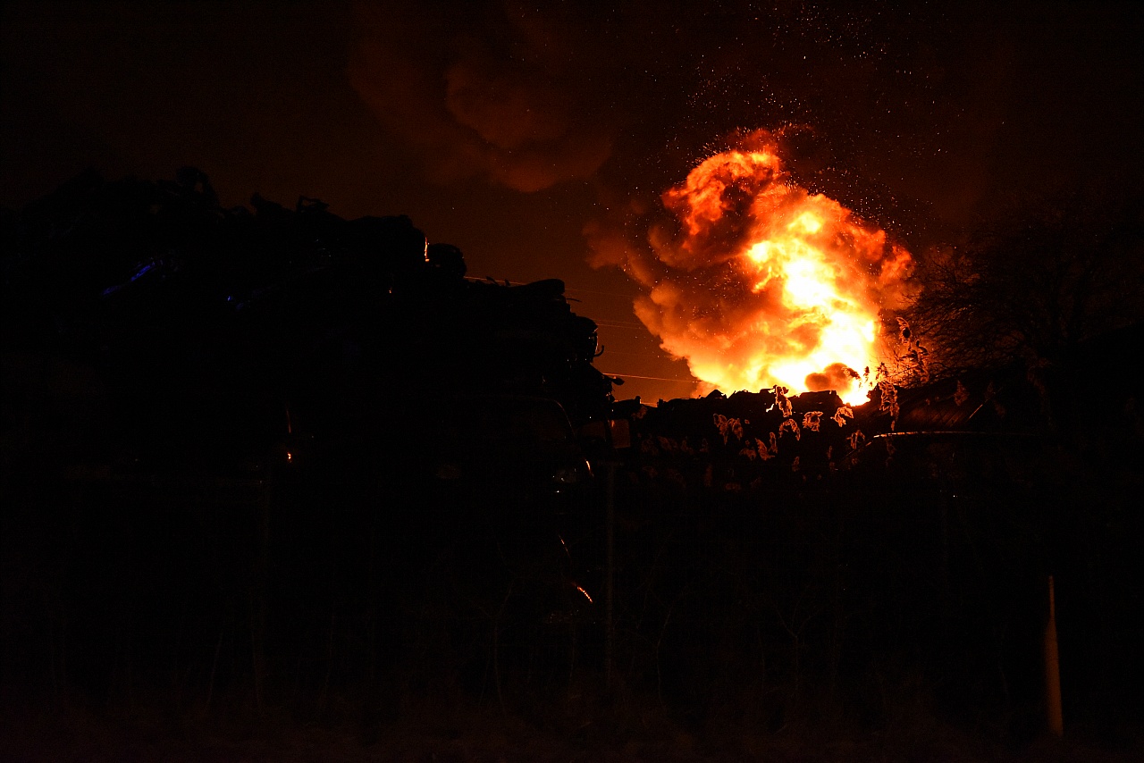 Rond 22.40 uur werd de hulp ingeroepen van een tweede bluswagen en een extra hoogwerker. “We gaan proberen om de brand van twee kanten te bestrijden”, aldus woordvoerder Anouk Bruintjes van de brandweer. “Bij de bestrijding van het vuur moeten we voorzichtig zijn omdat er over het terrein een hoogspanningsleiding loopt. Een expert komt ter plaatse om ons te adviseren hoe we dit het beste aan kunnen pakken.” Een aantal woningen op een woonwagenkamp die in de buurt van de brandhaard staan werden ontruimd.