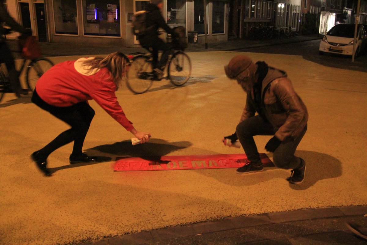 Dit is met krijtverf gedaan, en zal over 2 regenbuitjes weg zijn gespoeld.