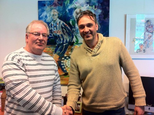 John Schurer (l) en Robert Maaskant schudden elkaar de hand. Foto website FC Groningen
