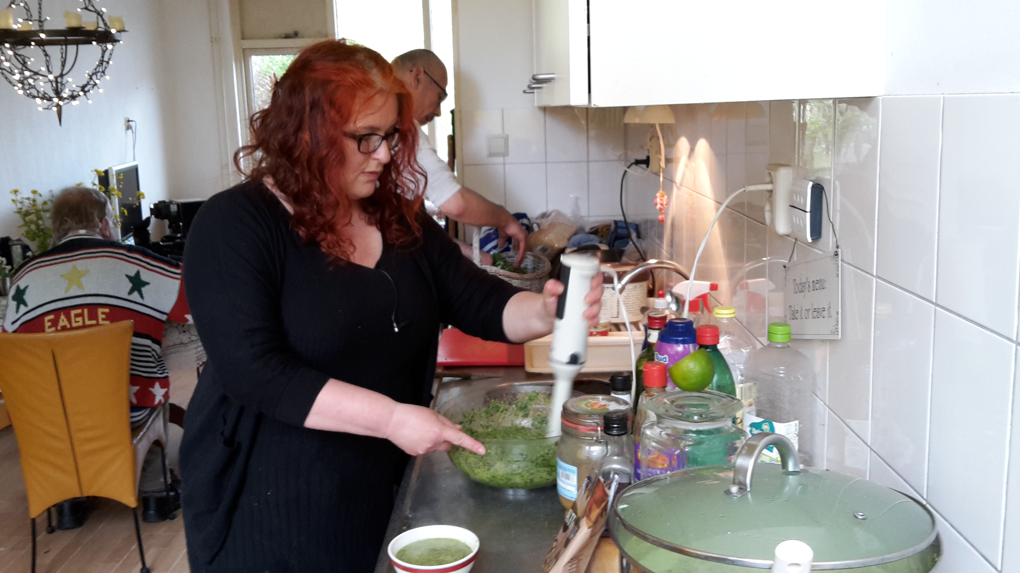 “Ik kook met kruiden en andere ingrediënten die ik zelf pluk en de groenten haal ik meestal bij de lokale groenteboer”, zegt Tanja Willems terwijl ze samen met een vrijwilliger druk bezig is met het menu van vanavond.