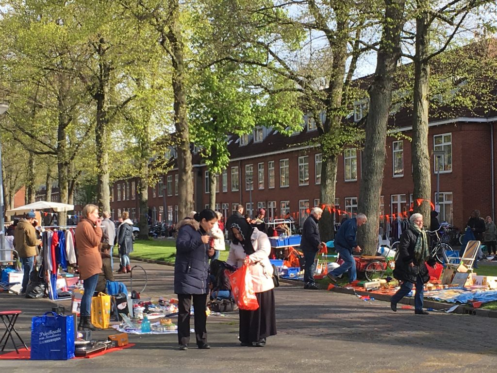 Met kleine oogjes staan de verkopers aan de Javalaan in Stad nog even wakker te worden. Het is Koningsdag en dat betekent: vroeg je bed uit om de rommelmarkt op te zetten.